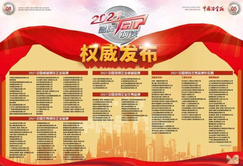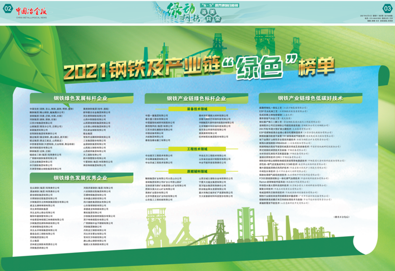 近期中國冶金報公布了2021年度中國鋼鐵品牌企業(yè)和2021年度鋼鐵及產業(yè)鏈“綠色”標桿企業(yè),我公司雙雙上榜。5月10日,第5個中國品牌日,公布了2021中國鋼鐵品牌榜單,公司再次榮獲中國鋼鐵工程技術類“優(yōu)秀品牌供應商”榮譽稱號,我公司已經連續(xù)兩年獲得中國鋼鐵工程技術類優(yōu)秀品牌企業(yè)。6月5日,世界環(huán)境日,公布了2021鋼鐵及產業(yè)鏈“綠色”榜單,公司榮獲中國“鋼鐵產業(yè)鏈綠色標桿企業(yè)”稱號。