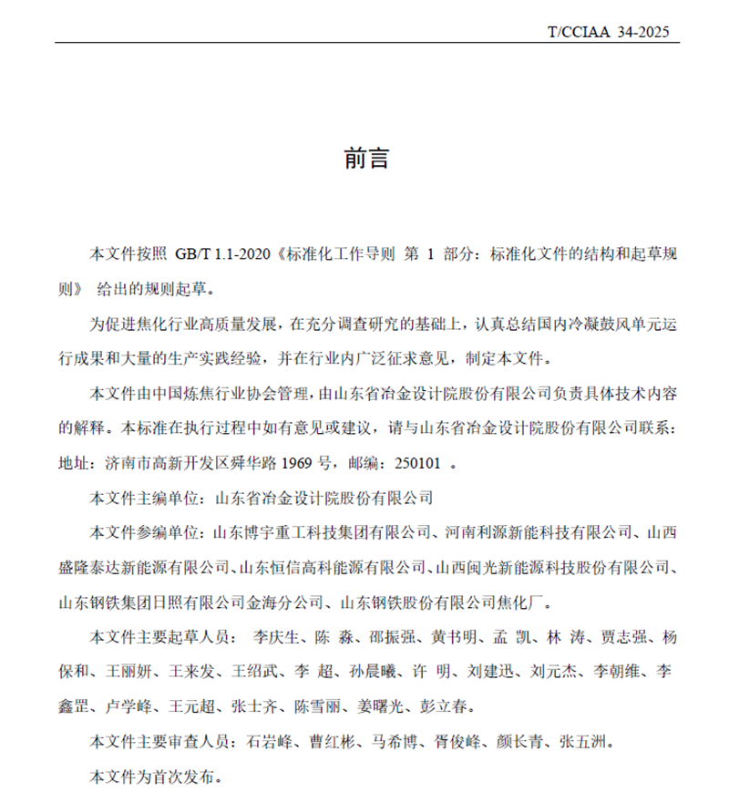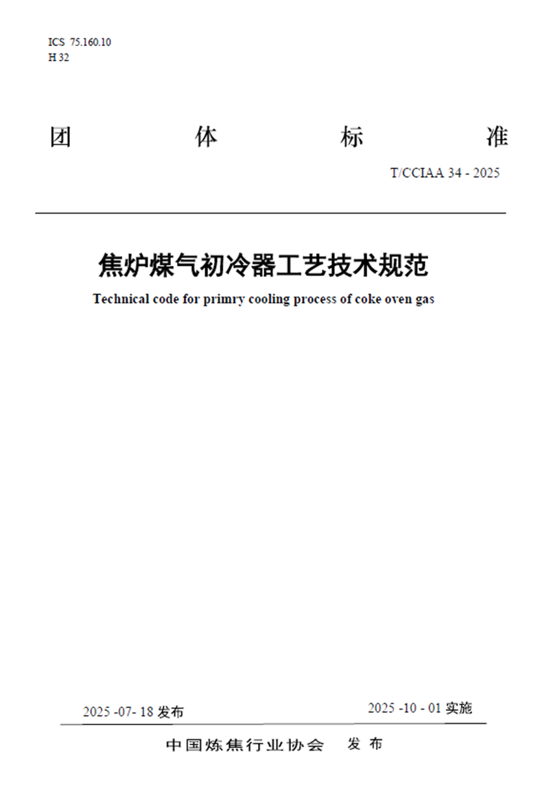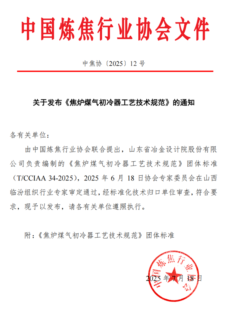 718日,由山冶設計主編的《焦爐煤氣初冷器工藝技術規范》T/CCIAA 34-2025(簡稱《規范》)正式發布并實施。《規范》對焦化煤氣凈化初冷器的工藝流程、操作參數以及質量指標作出了詳細規定,同時統一了初冷器的設計與操作標準,保障了煤氣冷卻過程的高效性與安全性。《規范》的發布與實施,可指導焦化企業在生產過程中有效把控初冷器的日常操作,為后續煤氣凈化及深加工的穩定運行創造有利條件。這是繼202471日正式實施、山冶設計主編的《焦爐煤氣脫硫廢液干法制酸技術規范》YB/T6115 - 2023之后的又一個行業規范,充分體現了山冶設計在焦化行業的技術引領作用與品牌影響力。