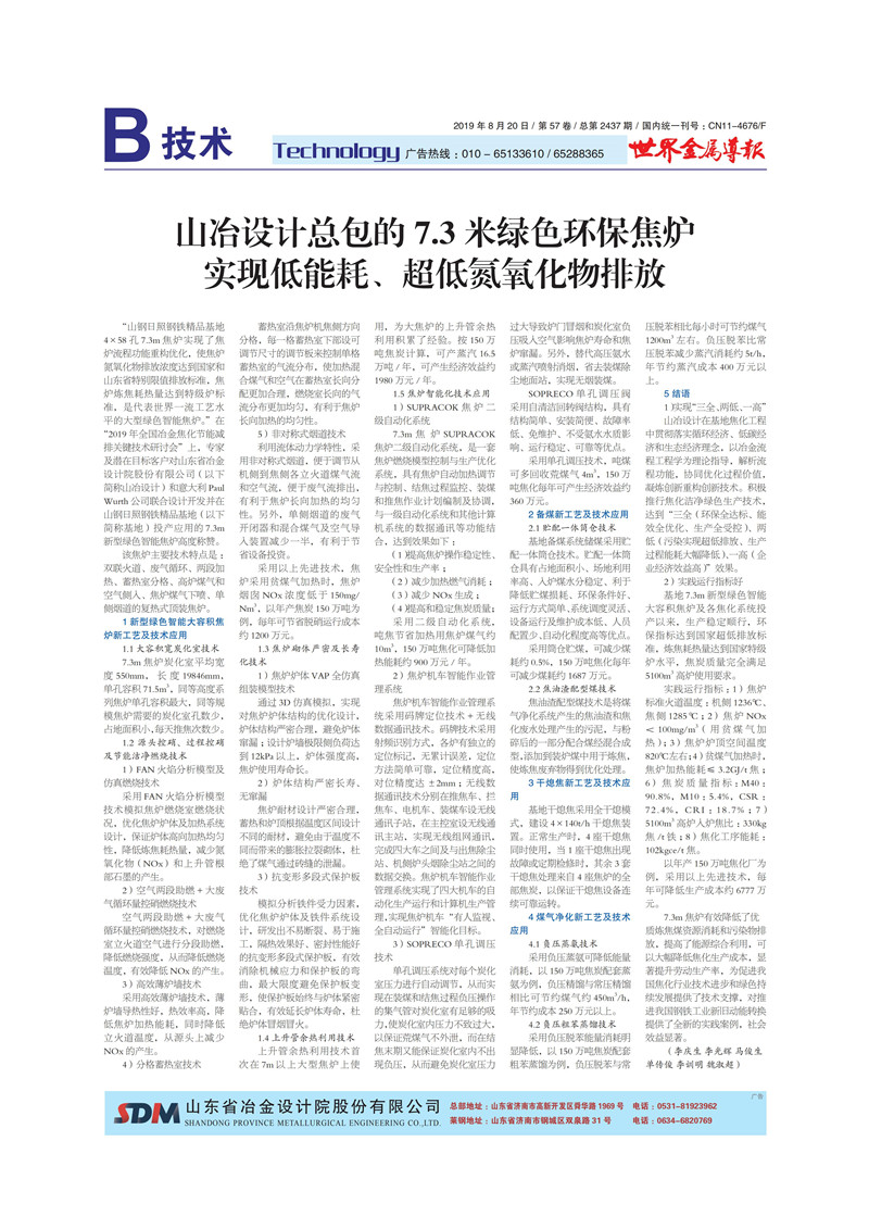 山冶設(shè)計(jì)總包的7.3米綠色環(huán)保焦?fàn)t實(shí)現(xiàn)低能耗、超低氮氧化物排放
